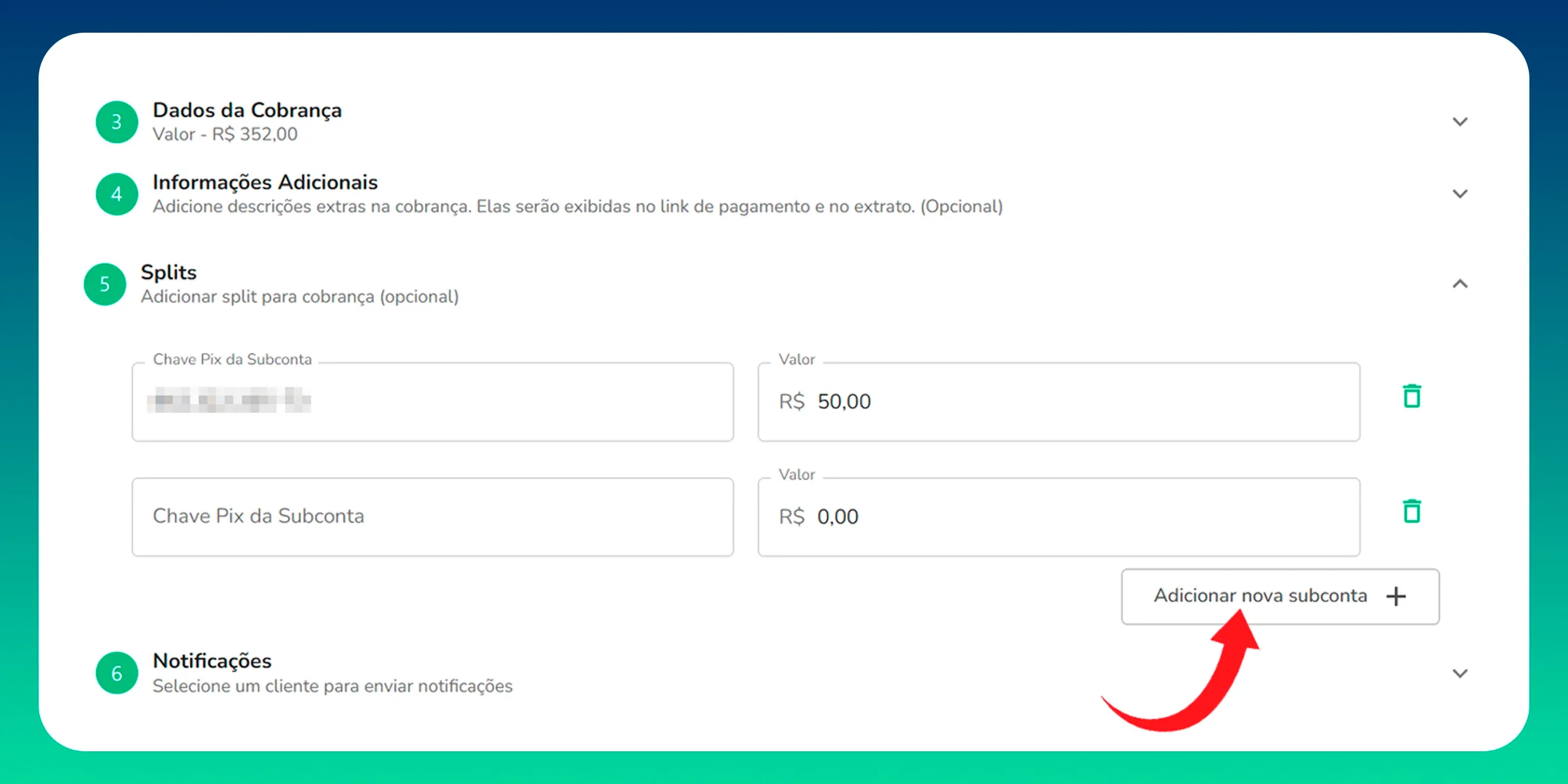 Cada subconta precisa apenas de uma chave Pix vinculada. Isso permite que plataformas criem uma estrutura financeira completa para múltiplos profissionais, sem burocracia.